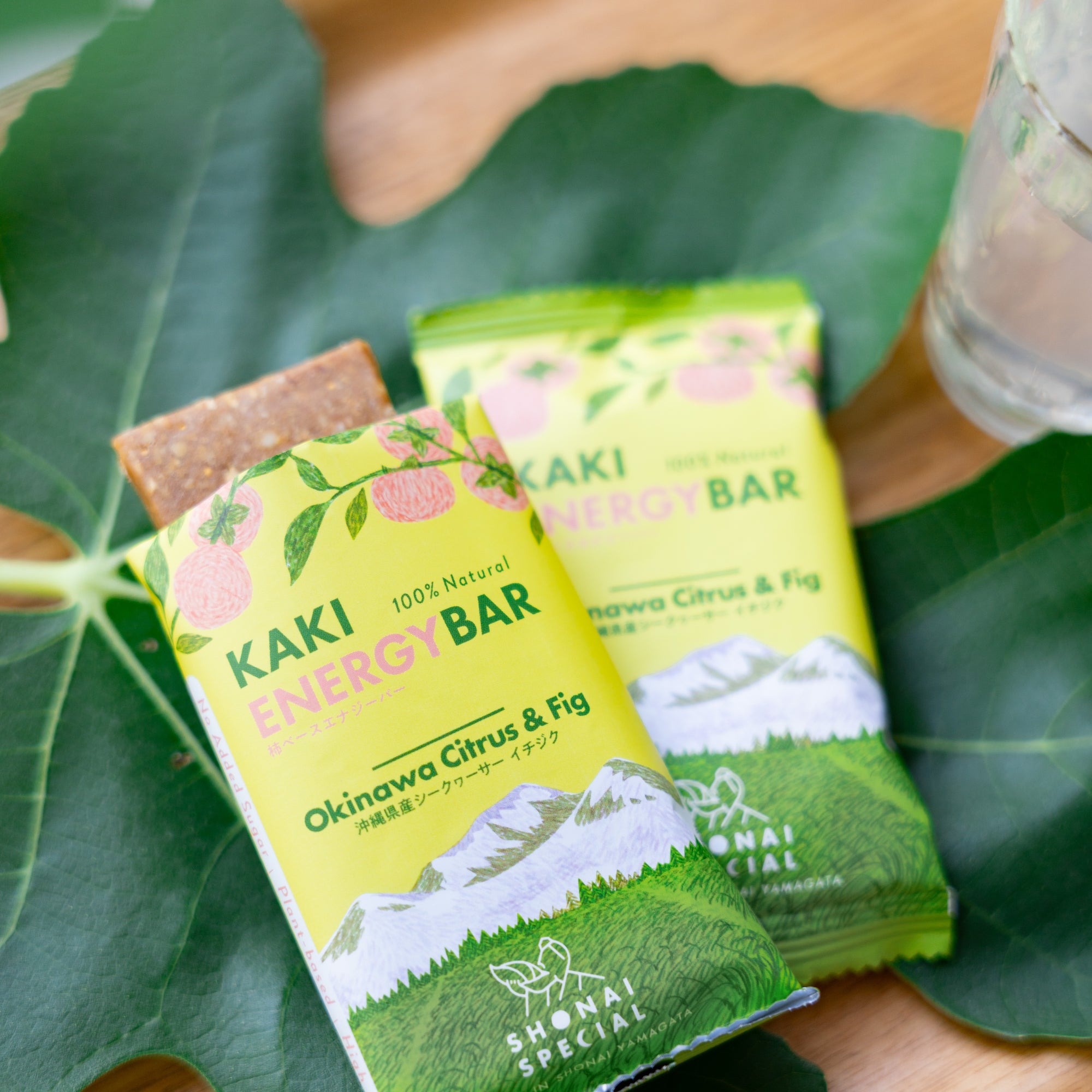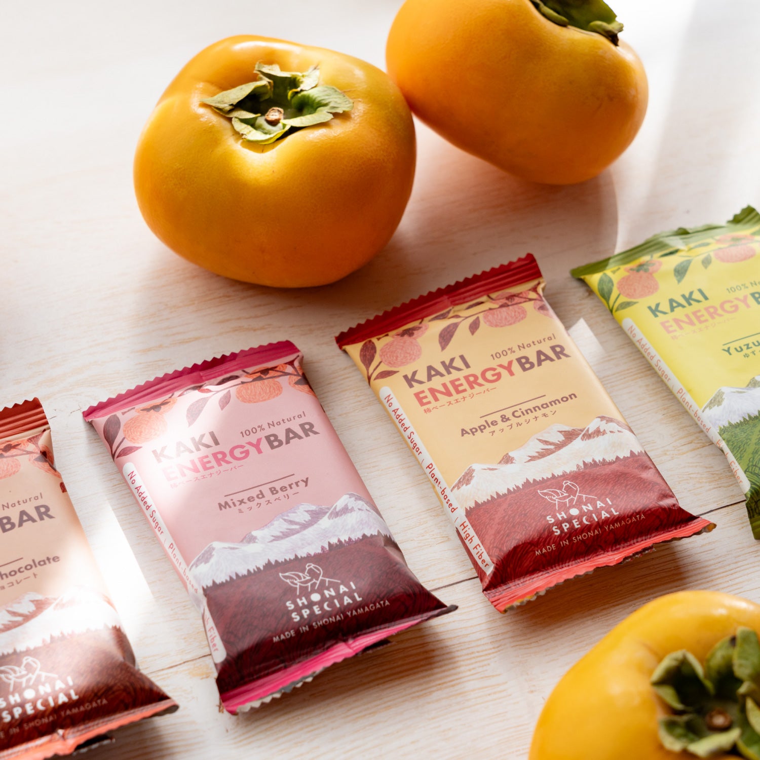 干し柿を使った「柿ベースエナジーバー」は、山形県庄内地域・地元の農家さんと一緒に収穫した庄内柿、米所庄内が誇る有機発芽玄米、栄養たっぷりのナッツ、オーツなど選び抜かれた食材のみを使用しています。様々なライフスタイルに、手軽に楽しめる“おいしさと栄養”を追求しました。
